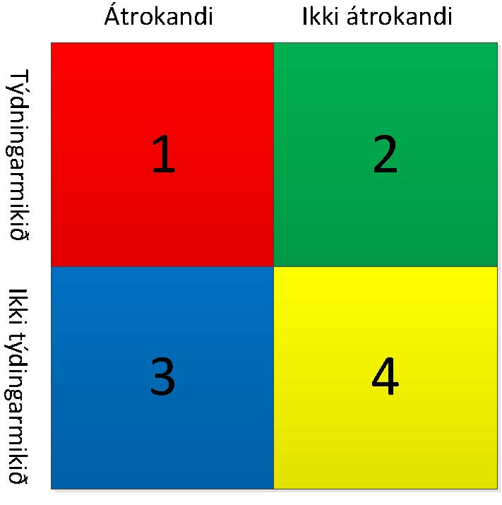 Tað týdningarmiklasta er at arbeiða við málum, sum kunnu bólkast í fýrhyrning 2. Her verður arbeitt við málum, sum hava stóran týdning, men tey eru ikki átrokandi. Til dømis at seta mál, leggja til rættis, fyrireiking og menning. Við at arbeiða við hesum, minka vit um talið av málum, sum kunnu bólkast sum átrokandi og týdningarmikil (fýrhyrningur 1).